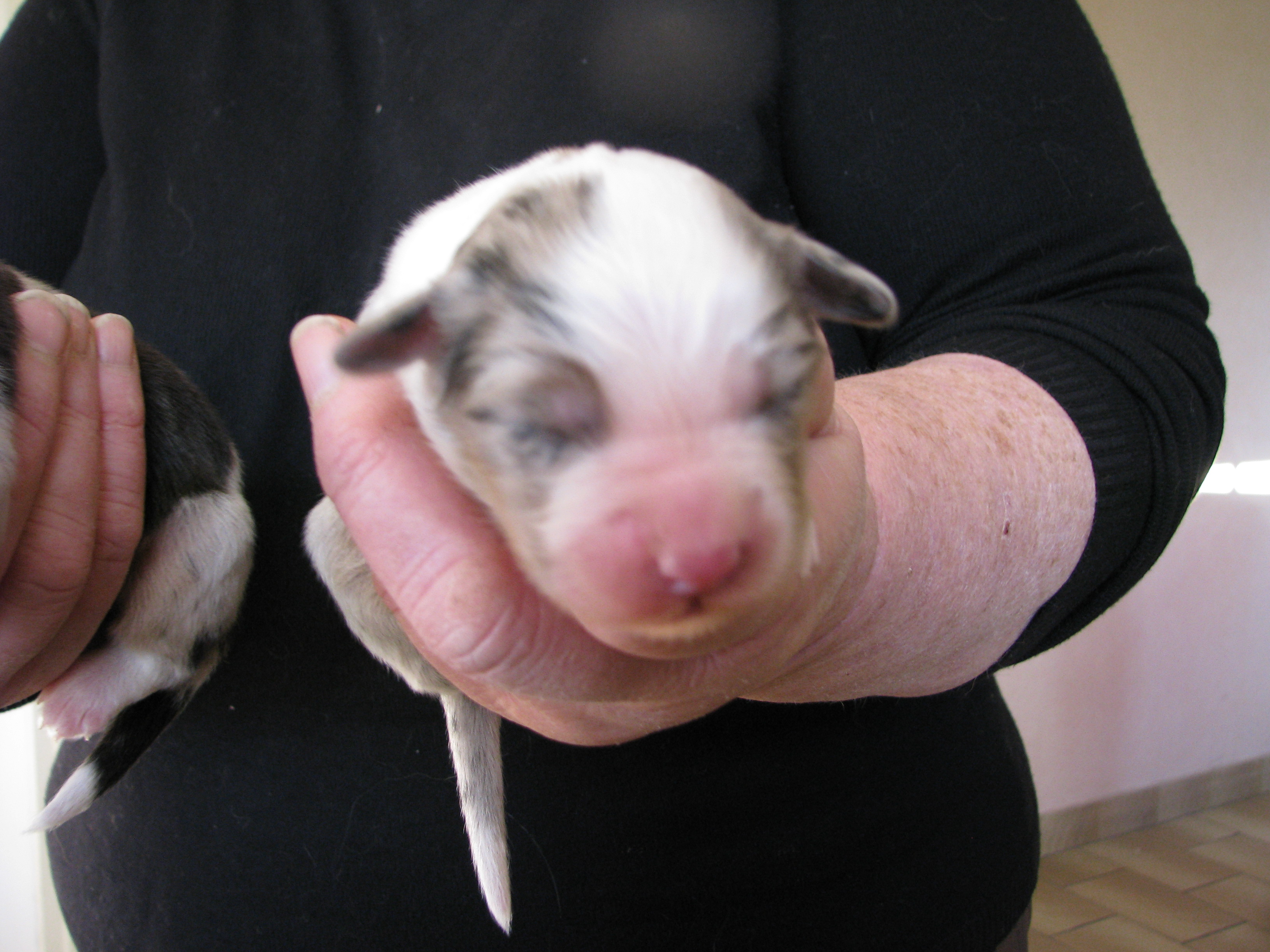 | Bonjour, voilà, mon bébé est enfin arrivée. C'est une femelle qui n'a pas encore de prénom. Ce sera peut être DASKA. son pere : ayrton de La Tour Mélusine sa mere : Aska des Mazellières la couleur : Bleue merle Mon pseudo : nathbleuemerle, d'Orvault(44) Elle est née hier et je l'attends depuis septembre, depuis que j'ai découvert les Bergers Australiens. Je dois décider rapidement si elle aura ou non une queue. Je vais la voir demain. Voilà, VIVEMENT DEMAIN ! Nathalie