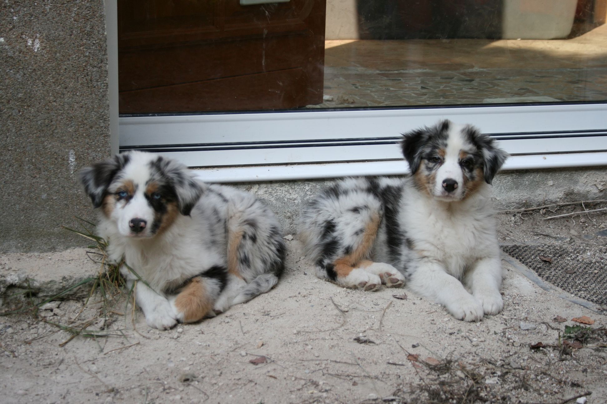 | Bienvenuuuuue !! Wooh deux d'un coup ! Déjà qu'un chiot ça fait mal au porte monnaie aussi bien lors de l'achat que après avec les vaccins, les croquettes, les jouets et tout et tout, alors deux d'un coup ! Mon Dieu ! Tu n'arrivais pas à choisir entre les deux alors t'as pris les deux, c'est ça? Tu aimes les bleus merle en tout cas !