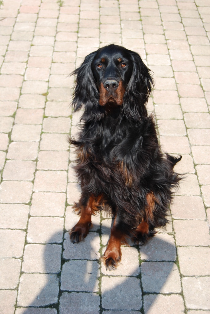 | Bienvenue Elle a un sacré poil ta fille!! Belle race, mais dur dur en chien de "compagnie" surtout à 4 ans en pleine force de l'age... Là où je montais à cheval il y avail un setter (irlandais) celui ci mais inarretable ds ts les cas Le gordon est un peu plus posé je crois mais demande bcp qd même!!On connait qqn qui en a 4 mais il les emmène à la chasse ( ) car ils sont en demandes!!!