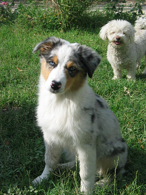 | Bonjour à toutes et à tous ! Je suis depuis un mois l'heureuse propriétaire d'une petite aussie (trois mois actuellement) prénommée EASI. C'est une petite chienne très joueuse, demandeuse de caresses et de présence et très affectueuse. Elle fait sensation autour de moi par ces beaux yeux bleus et sa robe merle peu courante, d'ailleurs aucune personne jusqu'à présent ne connaissait la race. Elle a rejoint notre famille composée d'une petite chienne bichon, deux chevres naines et bientot mon cheval nous rejoindra aussi ainsi qu'un ane. Nous vivons depuis peu à la campagne avec beaucoup de surface de terre et notre EASI s'éclate tous les jours. Je consulte souvent ce forum qui m'a apporté de précieux renseignements et suis ravie de vous y rejoindre. A bientôt