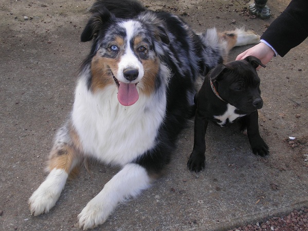 | voici notre nouveau compagnon de route une petite staffie!!! elle s'appelle gabanna. elle s'entend vraiment bien avec notre chienne c'est que du bonheur!!!