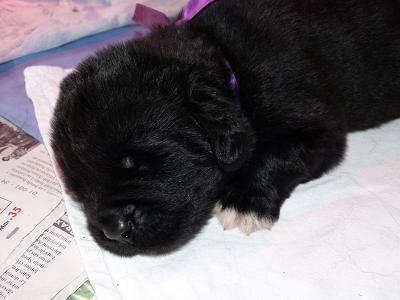 | Bonjour à tous, Cela fait quelques temps que je ne suis pas venue sur le forum. J'ai déménagé et il a fallu plus d'un mois pour obtenir une ligne internet... Du coup, je viens vous donner quelques news : Judy va très bien et fête ses ans aujourd'hui. Les chats sont en forme. Bébé newf (Louan) et les grands aussi. Et Lili est maman depuis jeudi dernier de 9 adorables chiots... C'est un mariage que j'attendais depuis longtemps et j'ai eu ce que je voulais (en couleur)... bref, je suis super contente! Les chiots et maman Lili se portent très bien! Je vous mets une petite photo : Monsieur Mauve - mâle mismarked