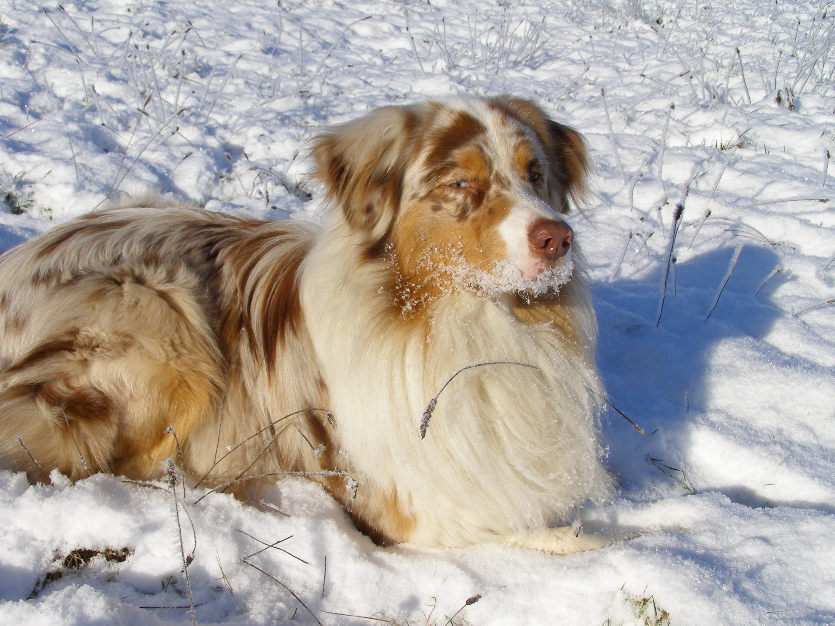 | Bonsoir à tous ! Voilà, je suis un jeune mâle de près de deux ans. Rouge merle, avec les yeux ambres tachés de bleu : autant dire que je suis le plus beau du coin ! J'habite à la campagne, dans le Cantal, avec un Fox Terrier, une chatte, des poules, un cheval et des chèvres. D'ailleurs, ma maitresse m'entraine au troupeau. Ça me plait alors j'apprends vite et je fais de gros progrès, cela m'a valu le CANT mais j'espère bien plus... Je suis confirmé et je verrais bientôt l'ophtalmo et le radiologue. On ne sait jamais, papa peut être un jour ?