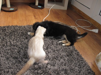 | c'est le grand amour avec les furets ils se font des parties de jeu à mourir de rire surtout avec Filou mon petit mâle