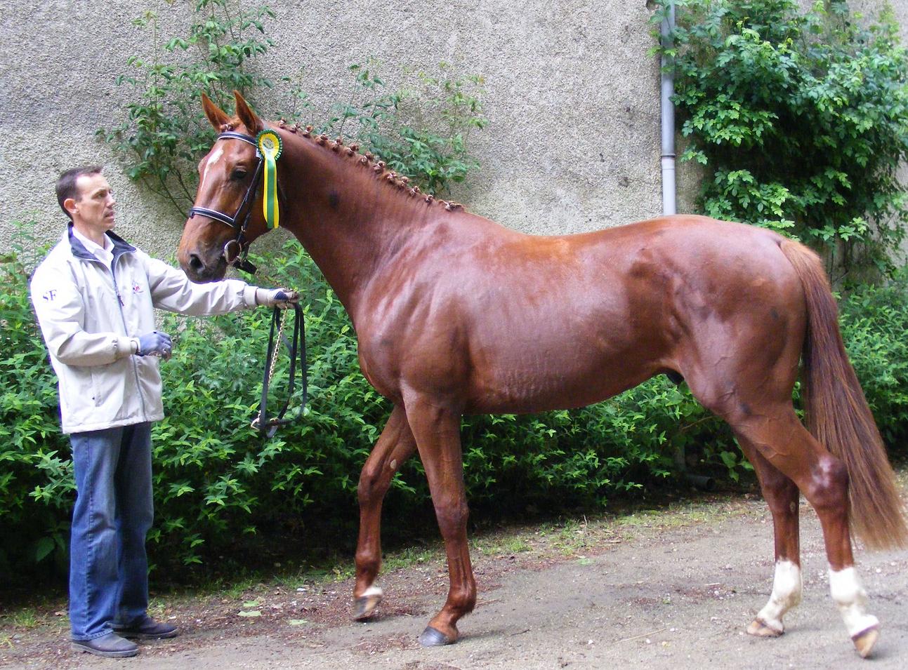 | la mère: jument Anglo-Arabe issue du croisement du Chef de race AA NITHARD avec celle du PS VERDI Son père Calin de Mels Etalon élite CSO à 4 et 5 ans est le fils de ALBAN A consacré en 2008 meilleur père de mère des chevaux de CCE Photo: