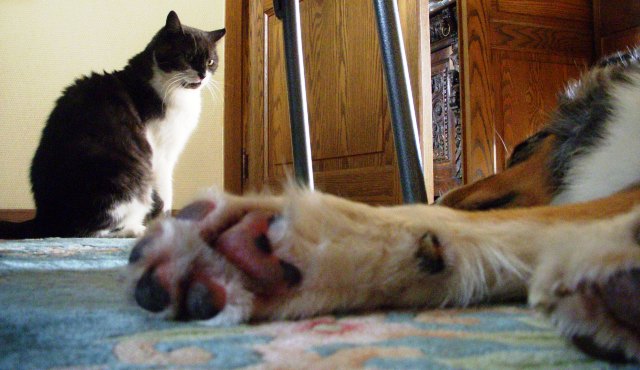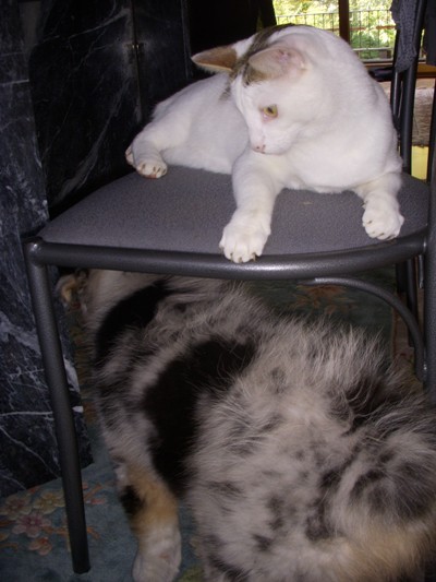 | Mes 2 chats, minou (grosse dondon) 12ans(la noire) et Silly (le chouchou, choubibi, mini silly, sillouche, le ptit blanc, le blanc moussi, etc.) 3ans(le blanc!) histoire de pattes