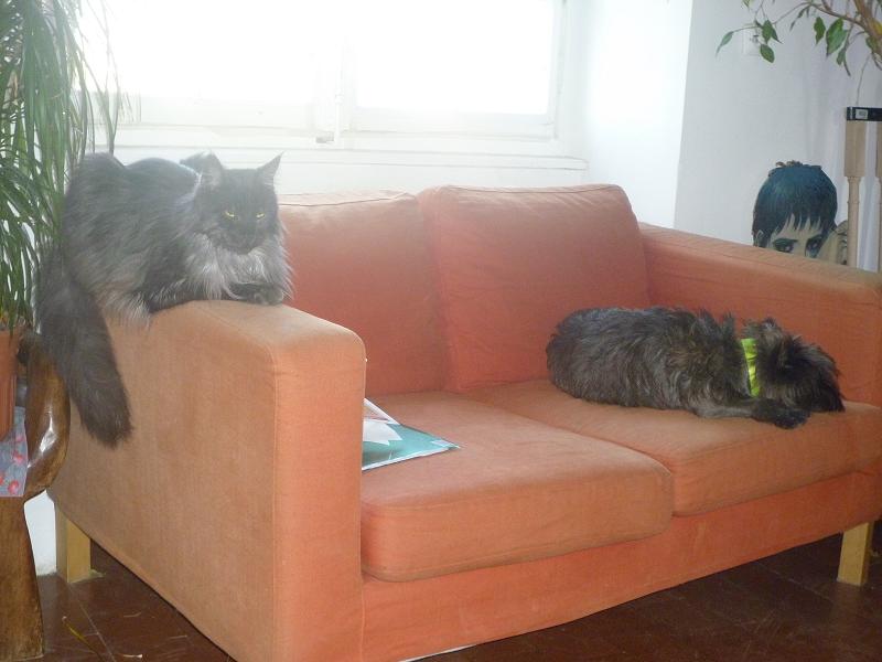 L'année dernière Cheyenne le maine coon est arrivé en mars, Neptune l'aussie en mai et Ficelle la 2eme maine coon en août. ça s'est très bien passé. J'avais la chance d'avoir de la place et donc les chats pouvaient soit aller avec les chiens( en plus un terrier de 4 ans), soit se mettre à l'écart quand ils en avient envie ( on avait mis une barrière pour bb). ça peut aussi être un arbre à chat en hauteur. c'est important pour un chat d'avoir un coin où il est sûr de ne pas être dérangé. En fait il faut que le chat soit suffisamment rassuré pour ne pas partir en courant quand il voit le chien. Du coup le chien se calme aussi beaucoup. ça a même marché avec vador, flippé des chiens, et de mon cairn en particulier, et le cairn en question Stitch ( Stitch avait 4 ans en 2009 à l'arrivée des autres et j'ai récupéré Vador cette année à 2 ans ). après c'est plus ou moins long suivant les chats et les chiens (Ficelle reste plus craintive, Cheyenne se laisse lécher les fesses ...) |