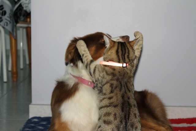 | C'est toujours beau à voir l'amitié chien/chat J'crois que son collier lui est trop grand par contre |