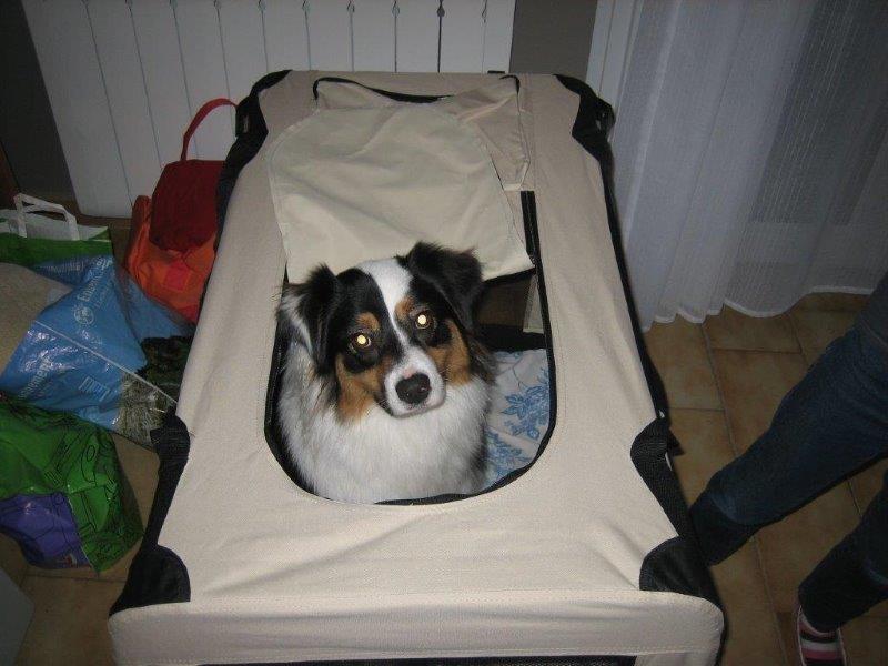 | | voici donc la caisse de voyage pliante dernièrement acquise, c'est drôlement bien , elle se plie super facilement et se porte comme une valise toute plate, elle tient à plat sous les valises dans le coffre (de ma C3 Picasso!!!!!!!!!!!!!!!!!!!!) Daho y va toute seule. Je laisse la porte ouverte! demain on test à l'hotel prix, environ 55€