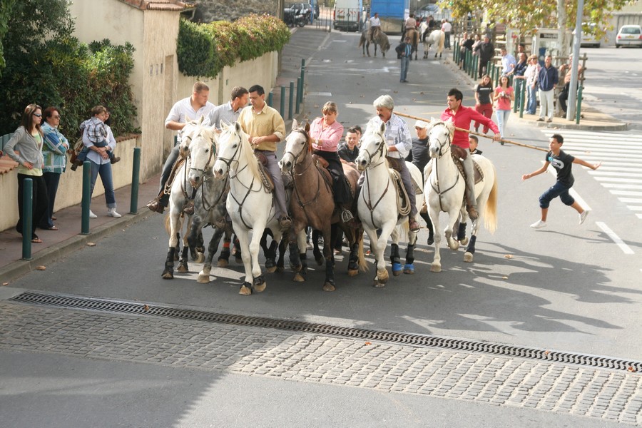 | Non, pas de chiens dans la tradition Camargue, rien que des chevaux ! Dans le vieux temps, lorsque les camions appellés "chars", n'existaient pas, les gardians conduisaient les taureaux au village qui organisait une course avec des raseteurs, de cette façon, les bêtes menées par les chevaux. Ce périple pouvait parfois durer deux ou trois jours, selon la distance du village organisateur; Dès lors, les gardians se reposaient à tour de rôle et les autres gardaient le bétail, à bâtons plantés, comme on disait, dans les herbages de tel ou tel fermier du coin qui se réjouissait de nourrir des taureaux de course !!! On appellait cela "l'abrivado", qui signifiait "arriveé" en occitan, puis, à la fin de la course, ils faisaient le chemin en sens inverse, ramenant les taureaux sur leurs terres, on disait alors "bandido", du verbe "bandir" en occitan qui veut dire "lacher ou rendre la liberté" au bétail ! De nos jours, sur un parcours sécurisé pour les gens, on reproduit le travail des gardians de l'époque, mais évidemment, on sort d'un char, et on enferme dans un autre char ! Le goudron est bien souvent très glissant, ce qui complique largement notre prestation, mais la passion nous animme, et là, plus rien ne nous arrête !! Tu vois, je t'avais dit que j'étais intarrissable !!
