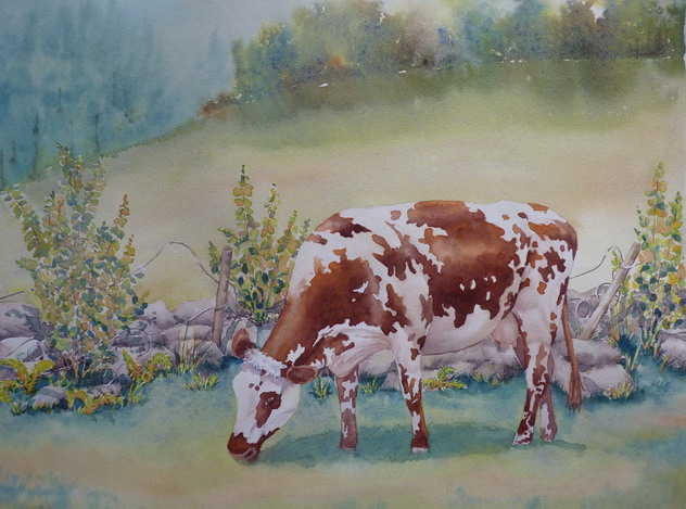 | La vache est vraiment magnifique. J'aime beaucoup tant l'animal que l'arrière plan... couleurs tout en douceur.