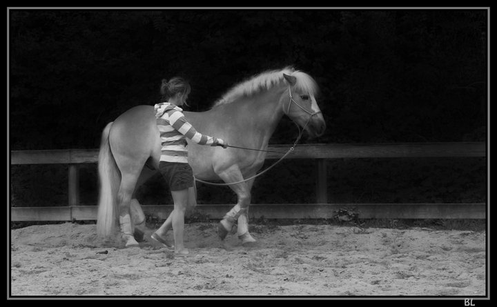 | C'est un petit Haflinger! J'ai une amie qui fait un peu de photos et qd elle a de nouveaux reglages à faire, elle se sert de nous ... Ce qui me fait plein de jolis souvenirs... Arwen a toujours été très proche du ponez, tjrs dans ses pattes, ds son boxe, à le suivre partout!Quand elle était petite je la prenais avec moi dessus et maintenant toutes les occasions sont bonnes pour grimper sur son dos! Sacré aussie! |