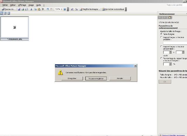 Fermez le logiciel Microsoft Office Picture Manager. ATTENTION : A ce moment la, le logiciel vous propose de nouveau d'enregistrer. ne le faites surtout pas! sinon il ecrase la photo originale avec la nouvelle taille.
